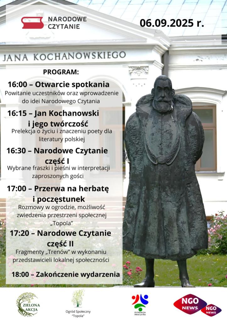 Narodowe Czytanie to nie tylko spotkanie z literaturą, ale także okazja do wspólnego spędzania czasu w otwartej przestrzeni społecznej. Ogród Społeczny „Topola” od lat jest miejscem integracji mieszkańców Radomia, a tym razem stanie się sceną dla ponadczasowej poezji Jana Kochanowskiego.